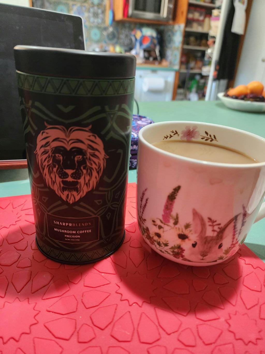 About ~38 mg per 4.2 g serve in our daytime blend—roughly a third of an espresso.